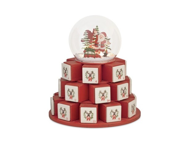 De madera, con 25 cajones, bola vidrio, nieve polistireno y luces leds