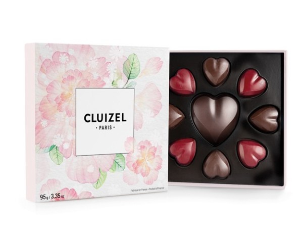 Surtido de 9 bombones, praliné caramelizado y trufado con corazón gigante de chololate Kayambé negro