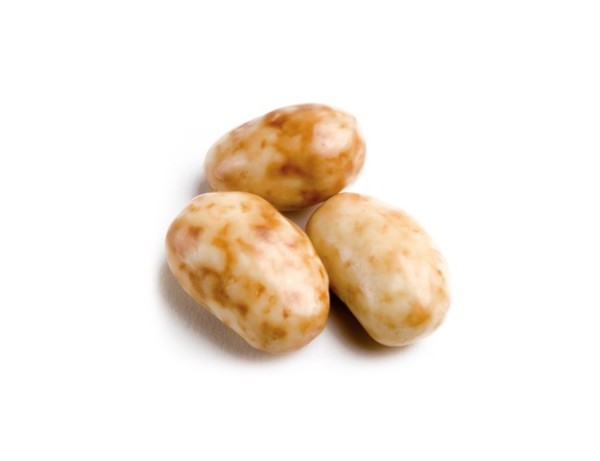Almendra tostada cubierta de crema de turrón y bañada de chocolate blanco