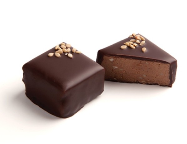 Caja de 1 kg - Praliné mezclado con granos de sésamo obteniendo un sabor sutil y de moda, 60% almendras y avellanas con granos de sésamo. Baño con cobertura negra ecuador 70%