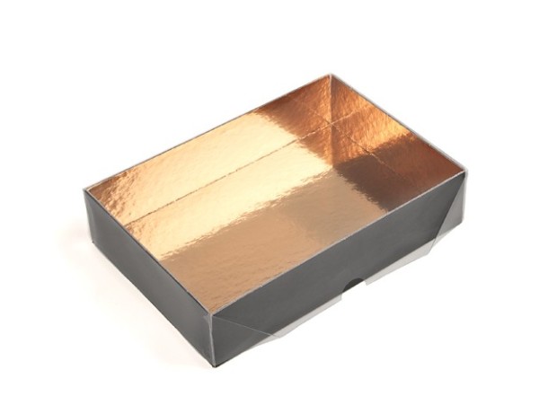 Fondo cartón exterior negro interior oro para pastas de té, pastelitos... Servido en plano